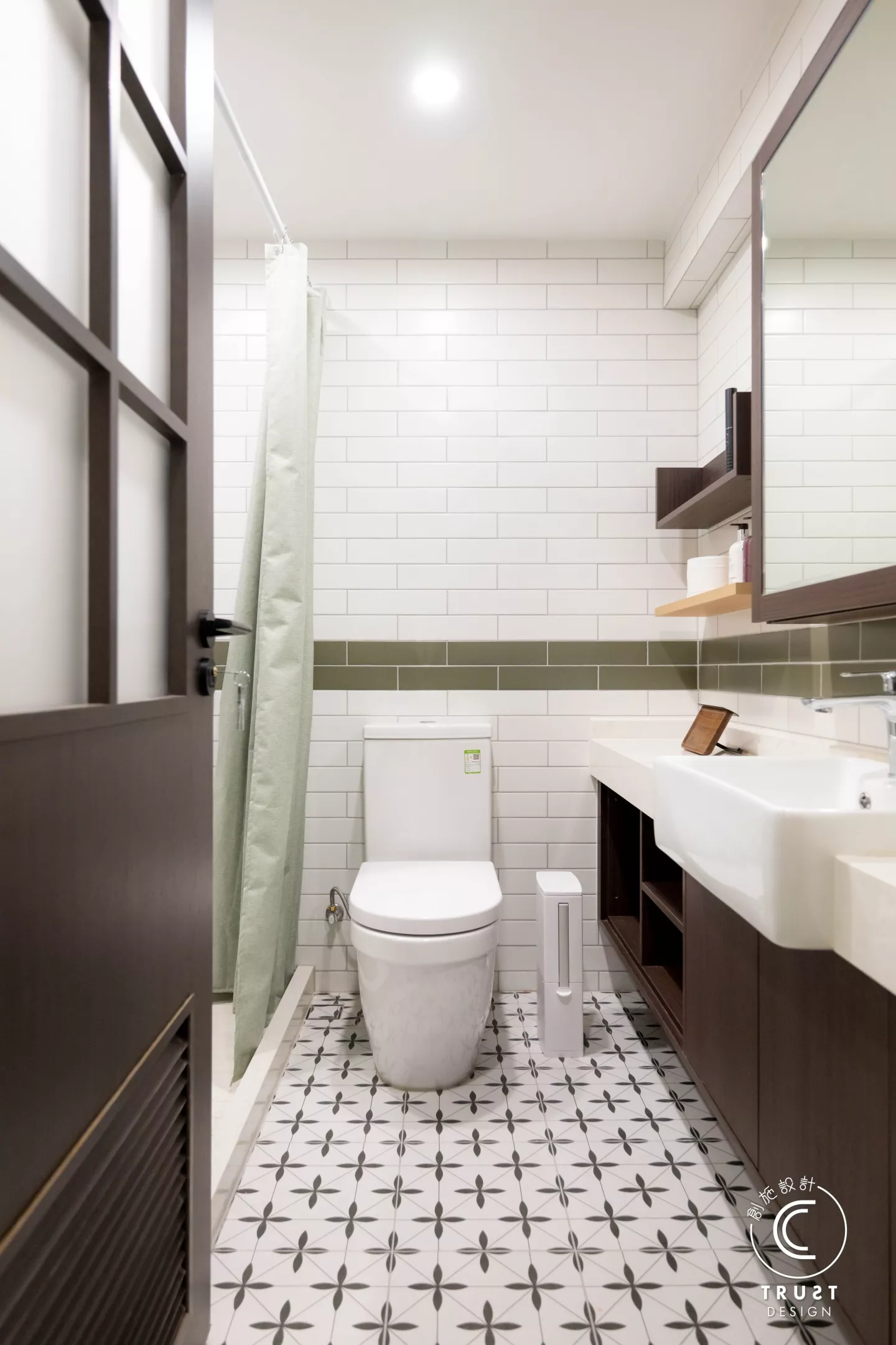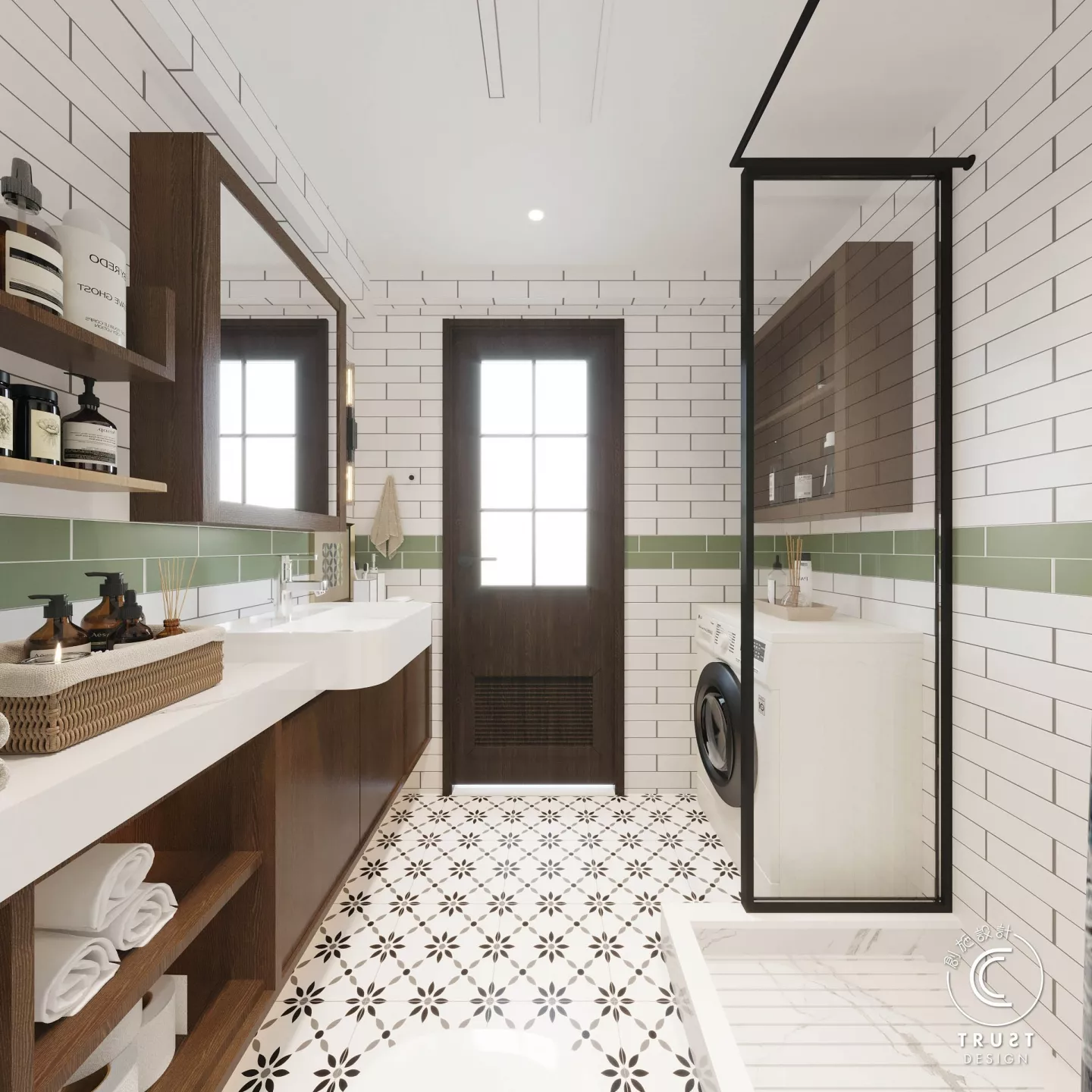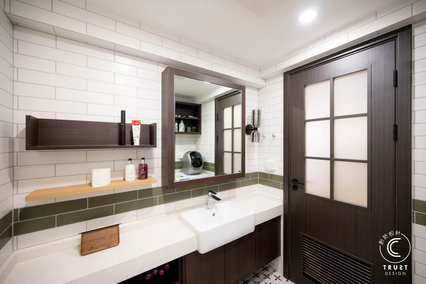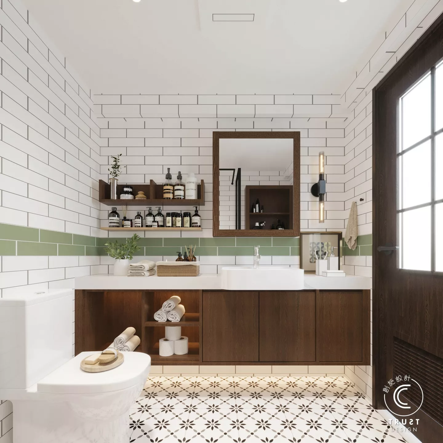 復古氛圍沁染其中,木色調、綠、白色條狀磚和花紋磚裝飾交織出獨特的復古風格。