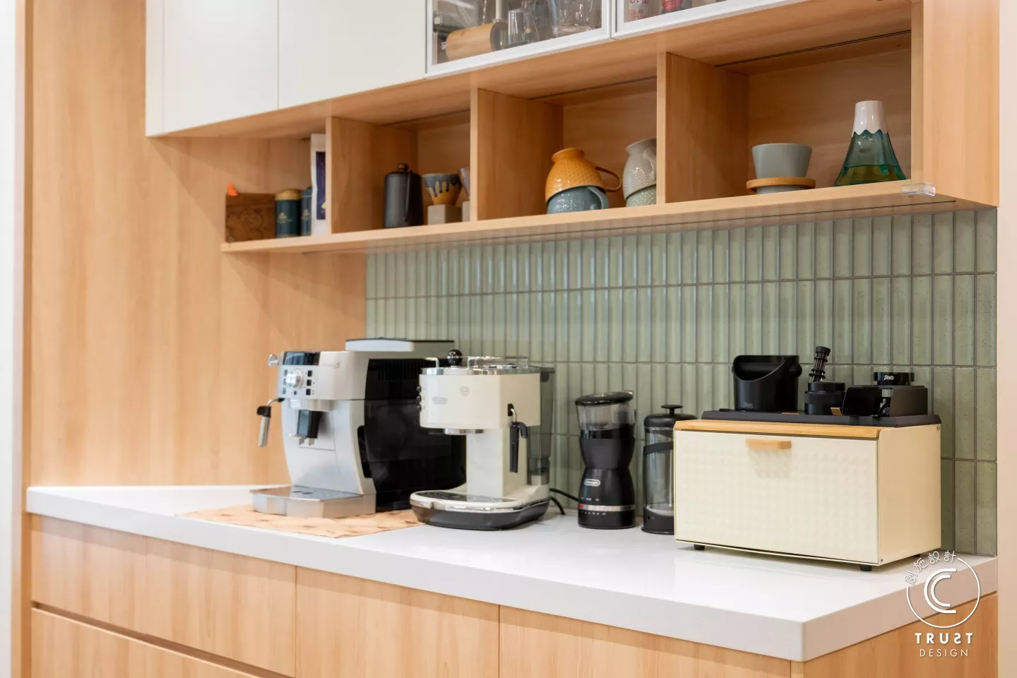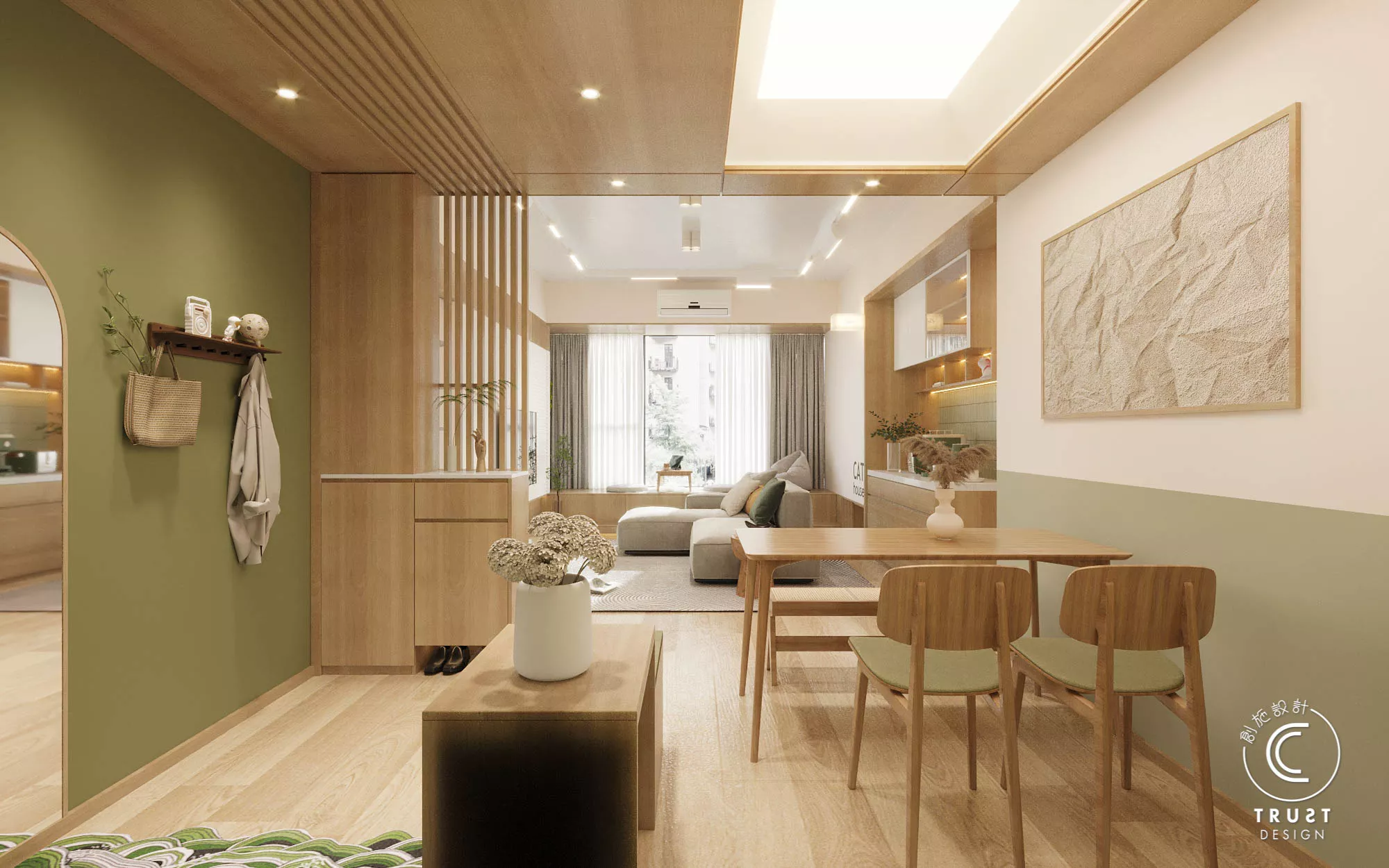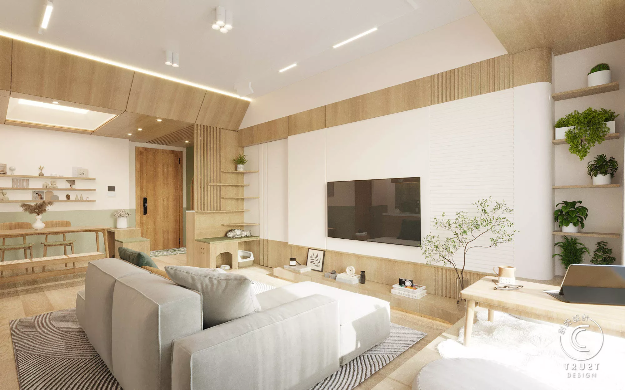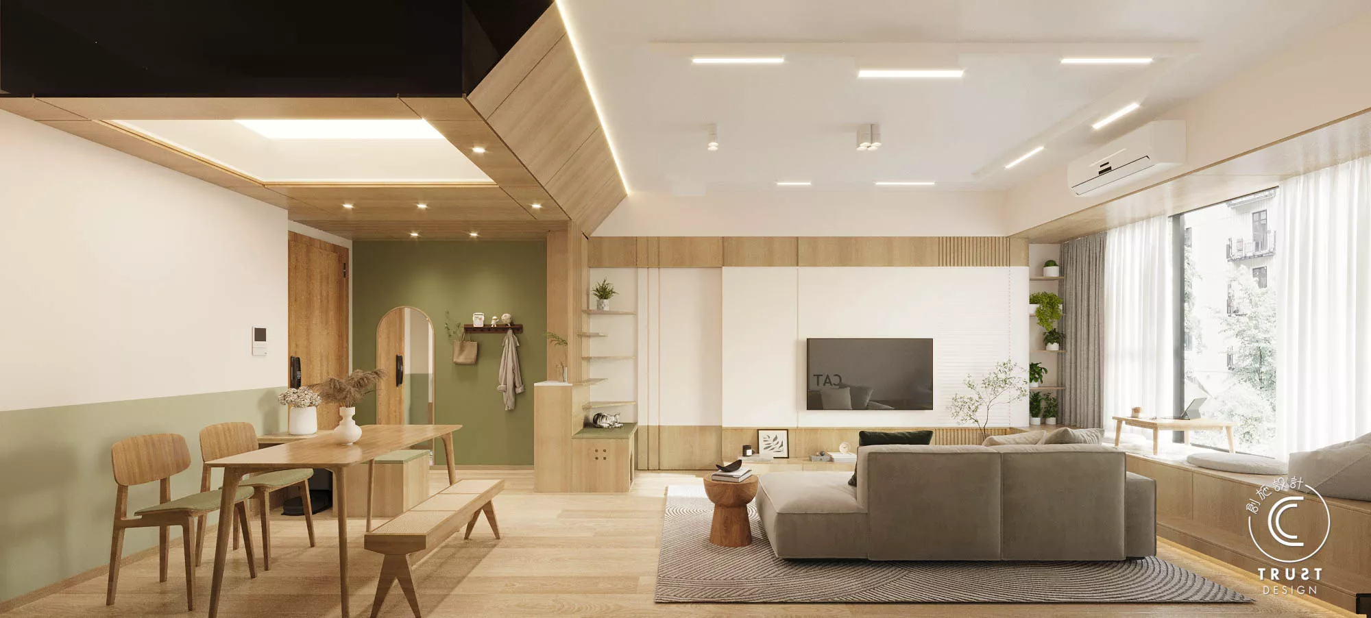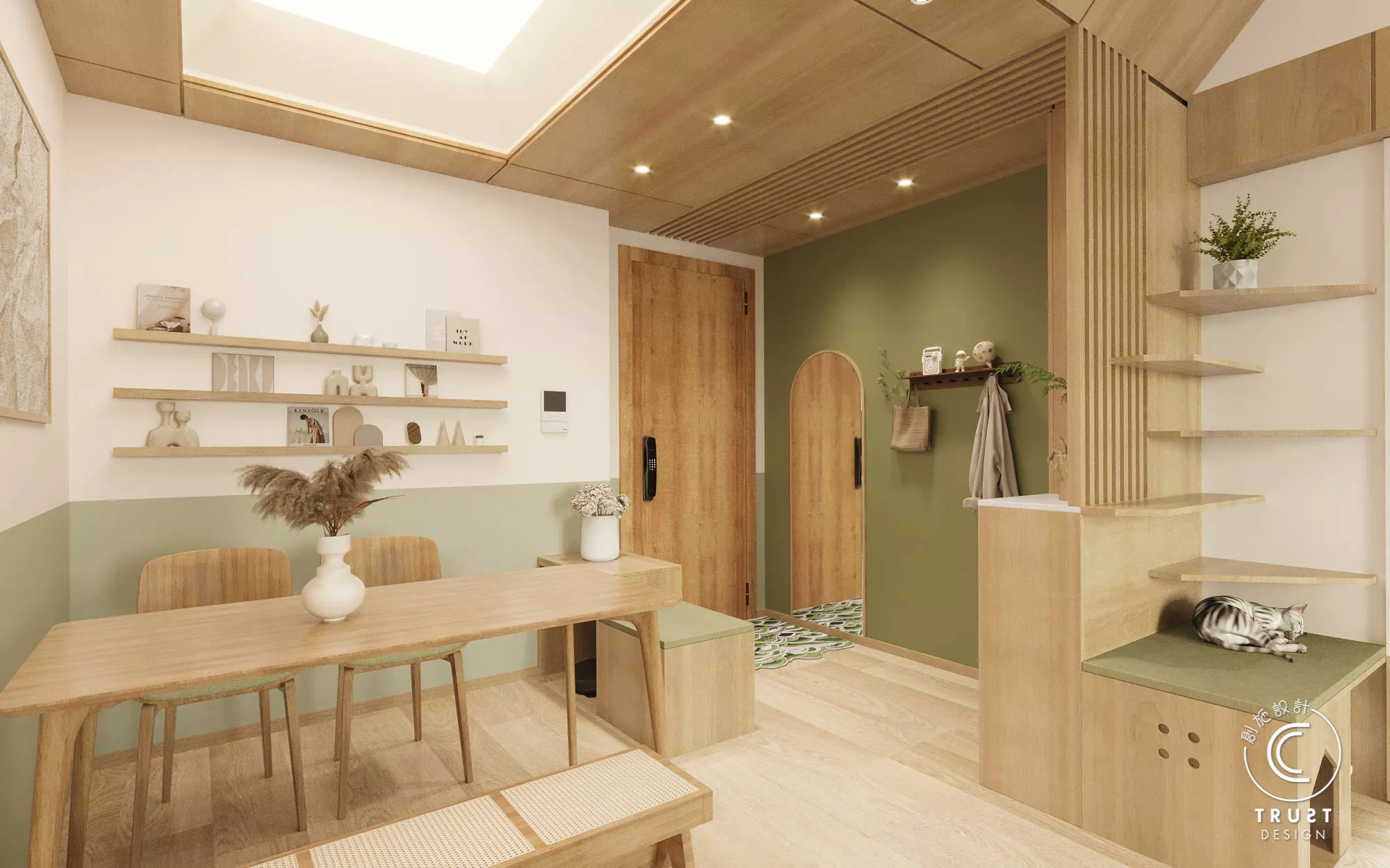 白色、木色和清新的綠色相互交織,創造出一種和諧而舒適的氛圍,就像品味抹茶拿鐵時的愜意和放鬆感一樣。