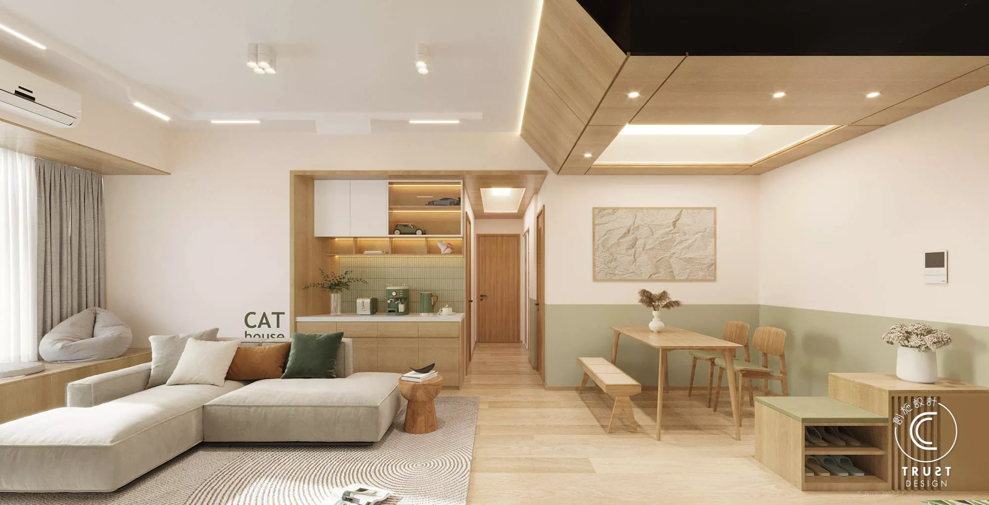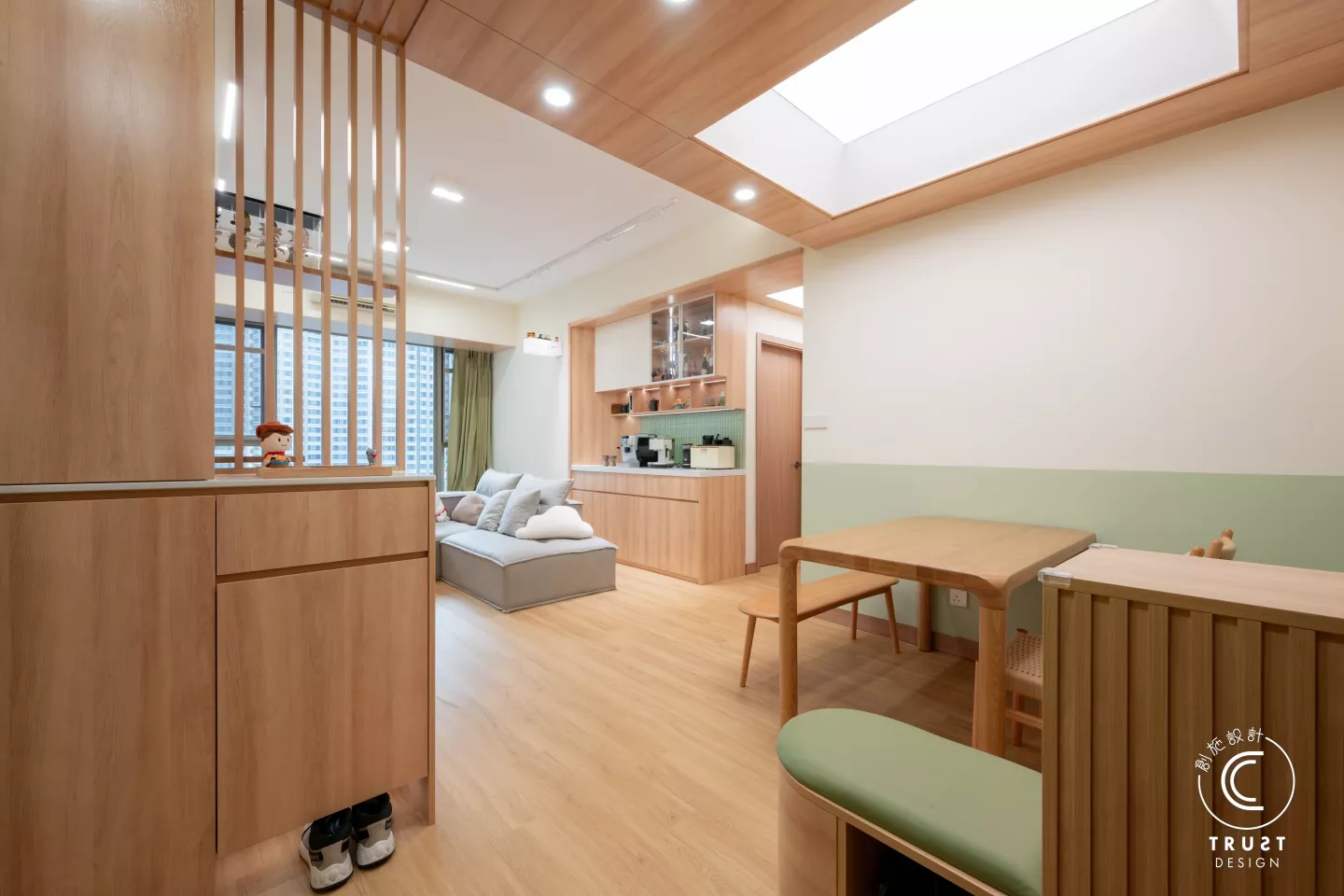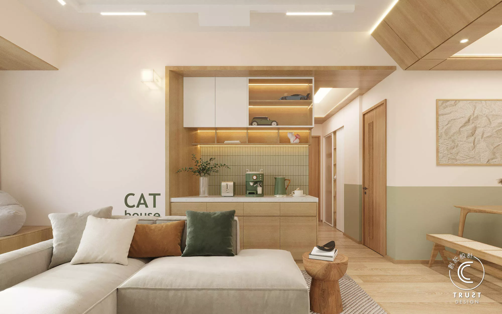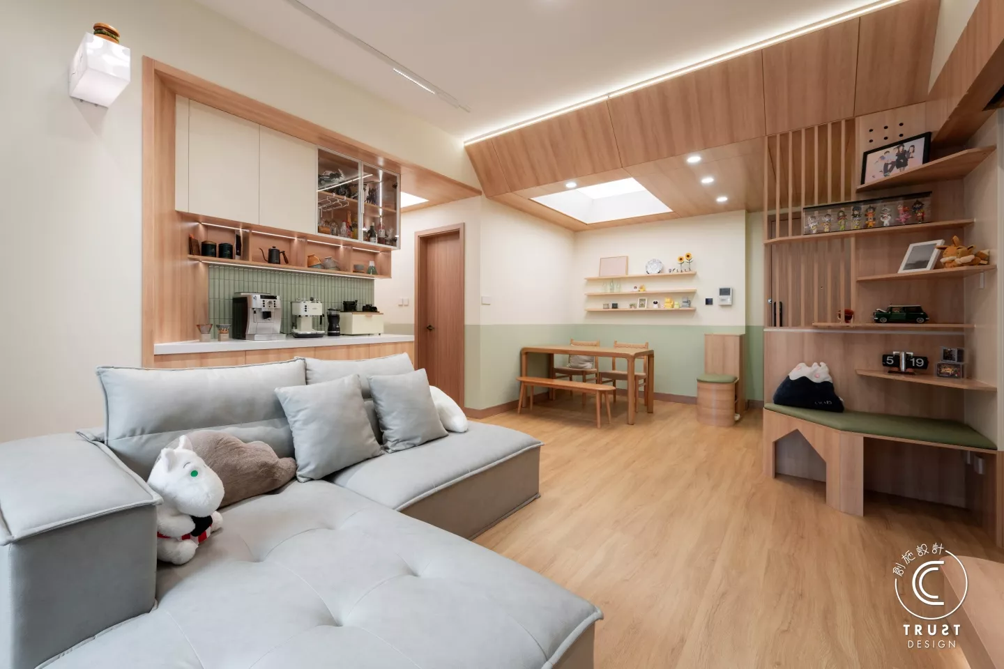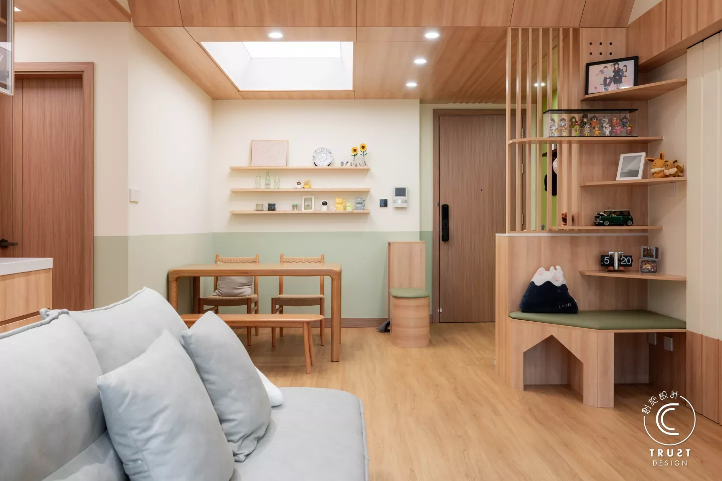 白色、木色和清新的綠色相互交織,創造出一種和諧而舒適的氛圍,就像品味抹茶拿鐵時的愜意和放鬆感一樣。
