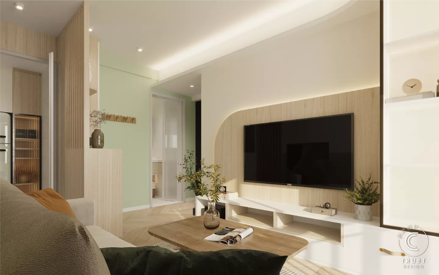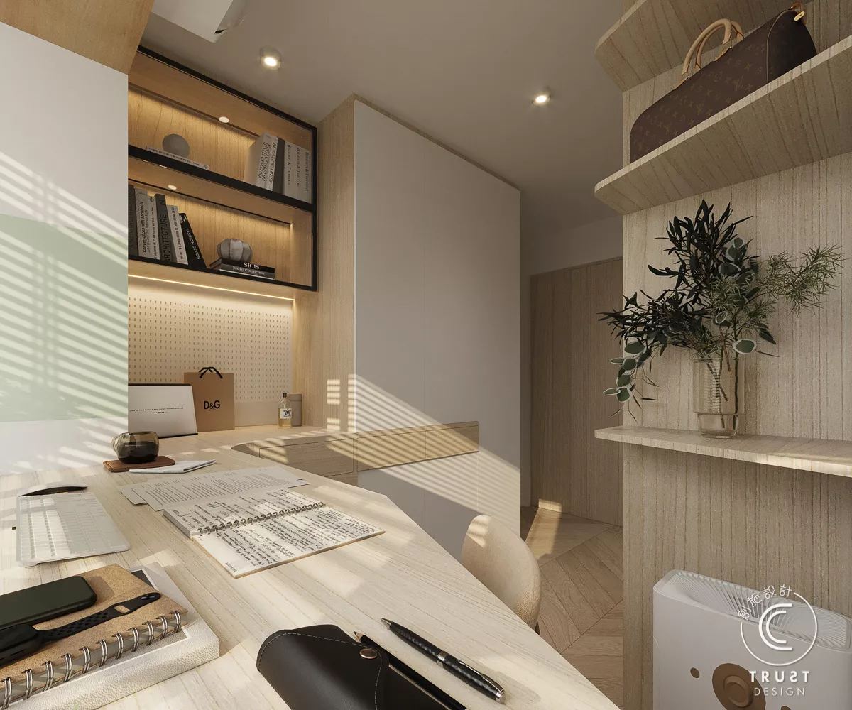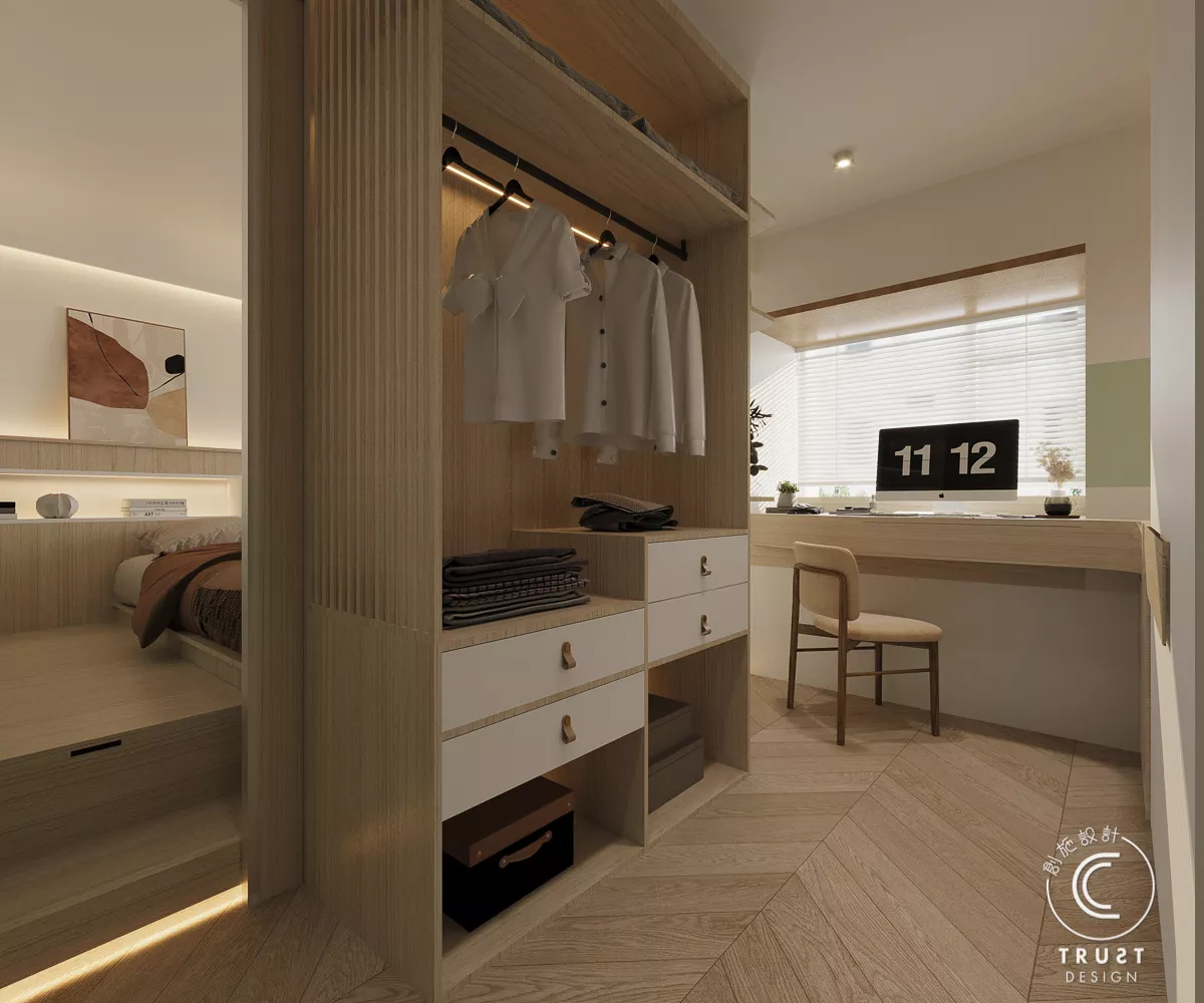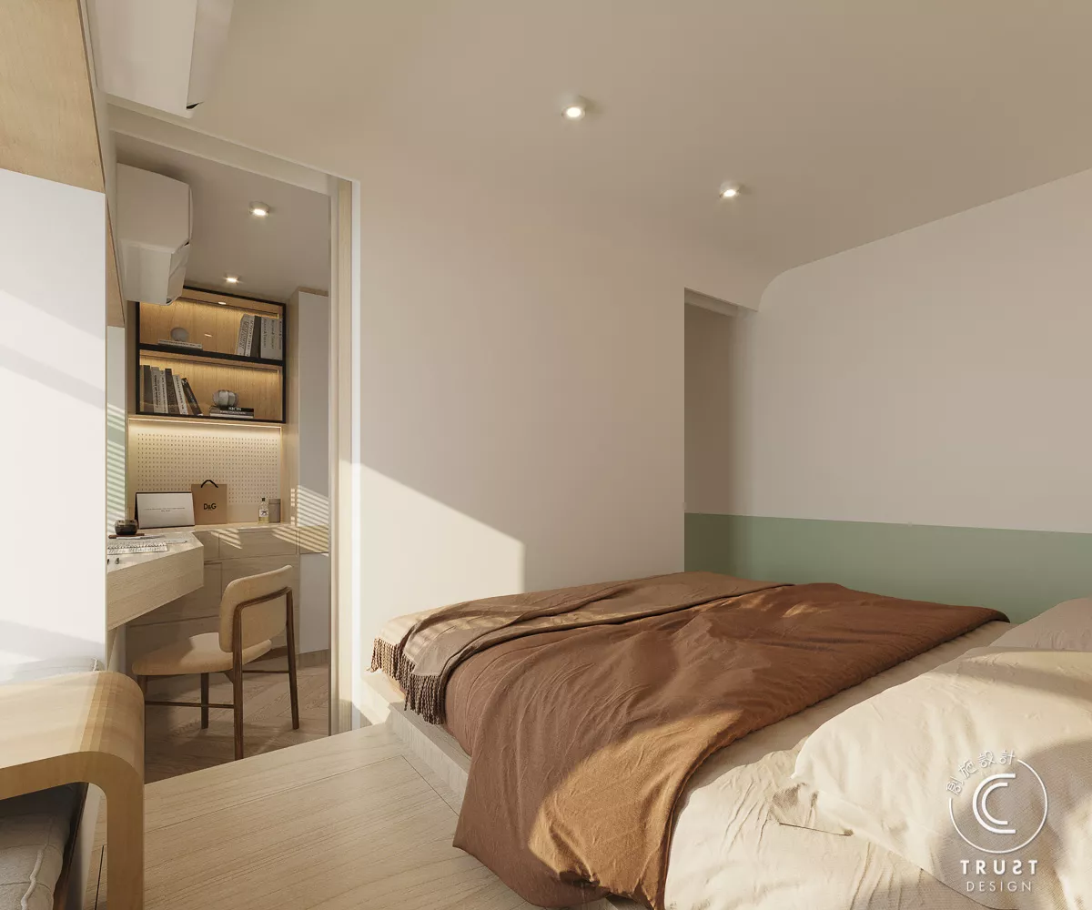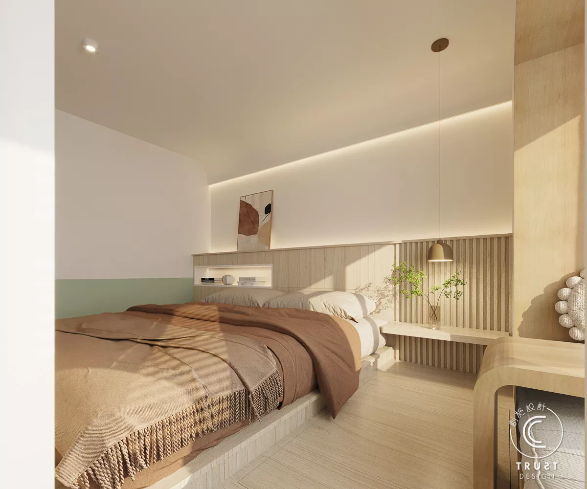 在日系風格中木色和白色基調上,我們以低飽和度的綠色點綴,為整體色調增添了一抹生氣,使空間更具活力,同時保持了原有的和諧感。
