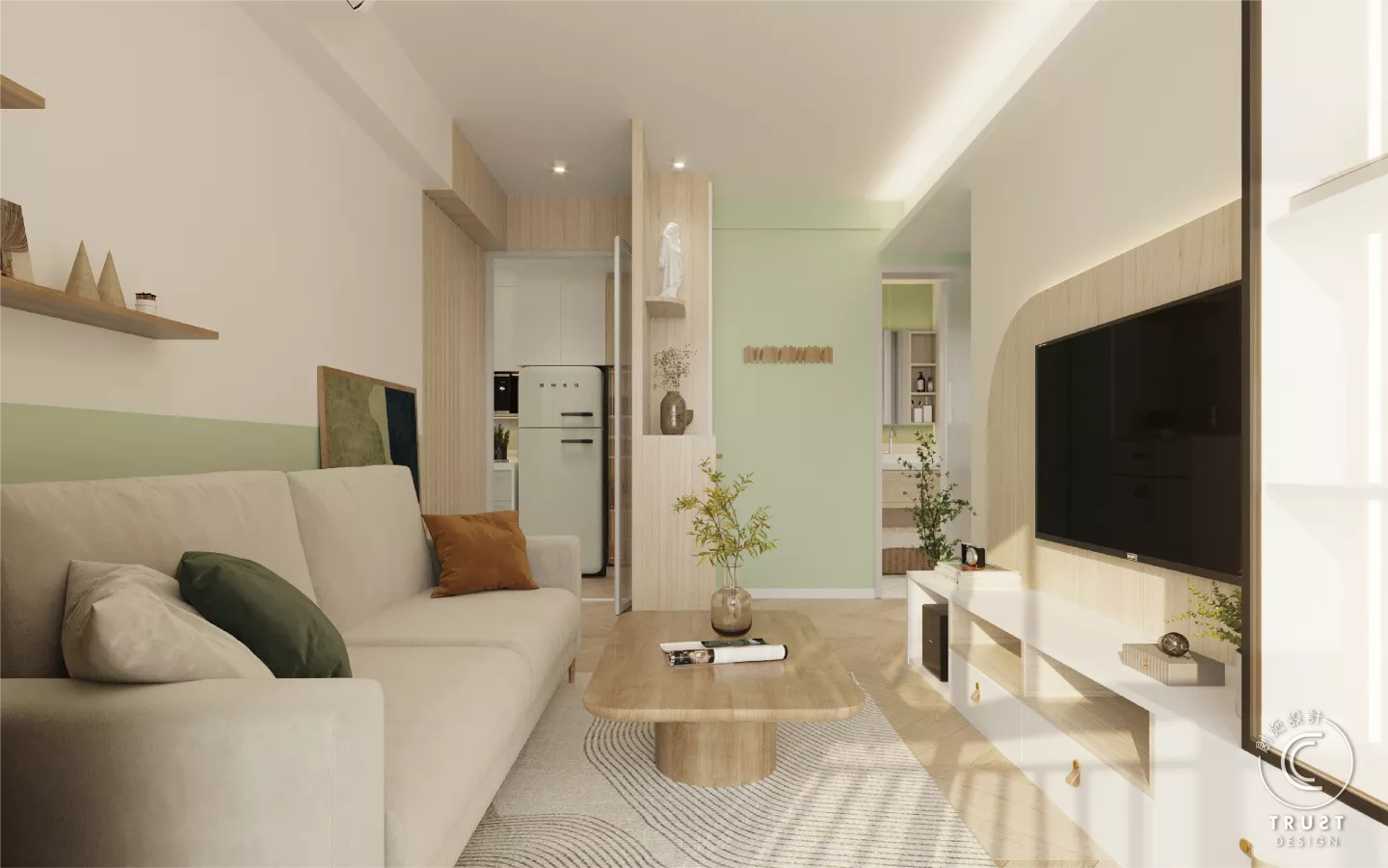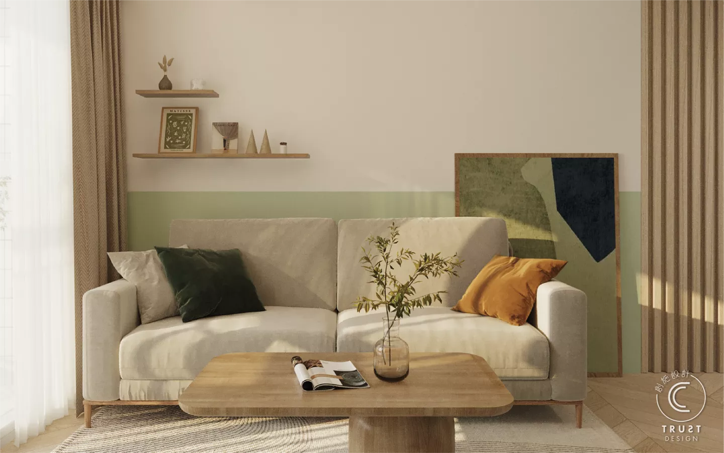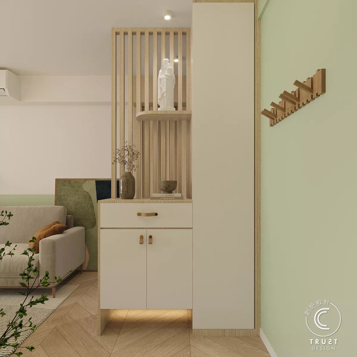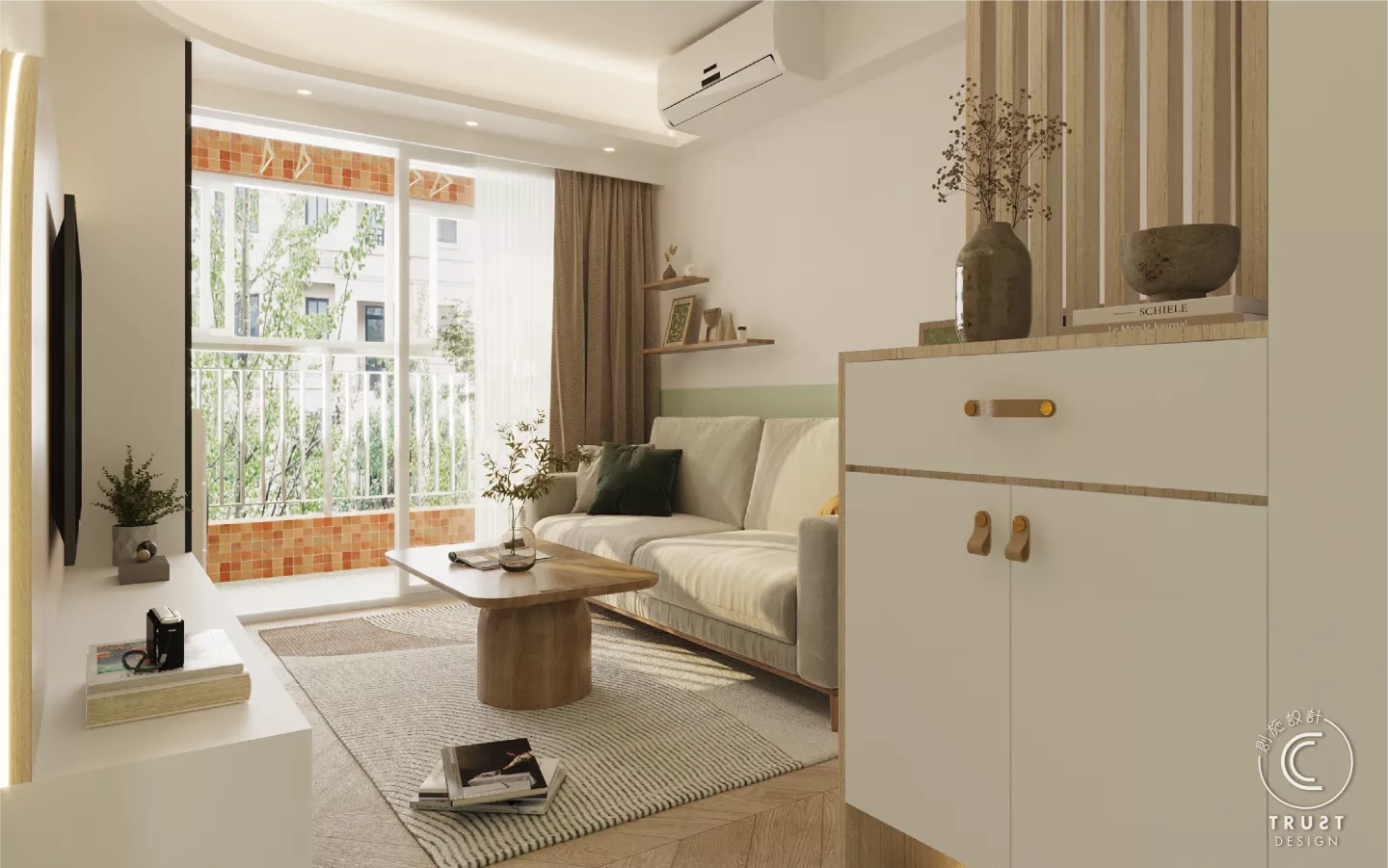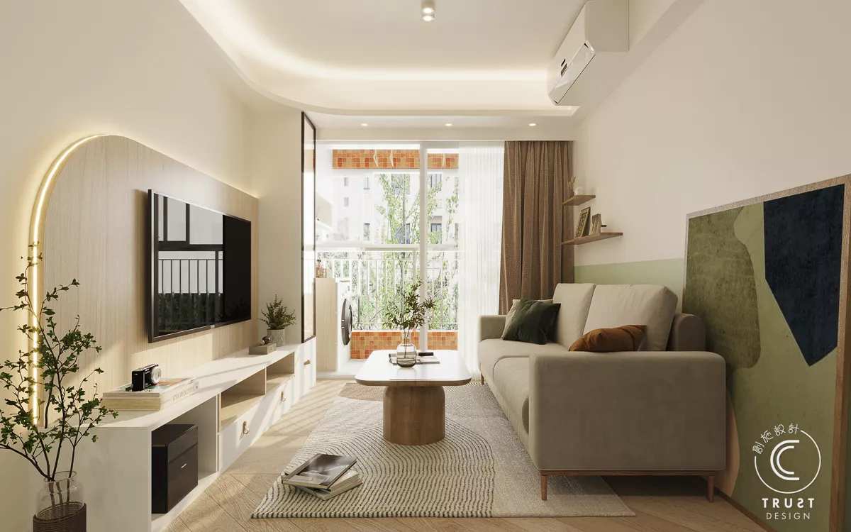 在日系風格中木色和白色基調上,我們以低飽和度的綠色點綴,為整體色調增添了一抹生氣,使空間更具活力,同時保持了原有的和諧感。