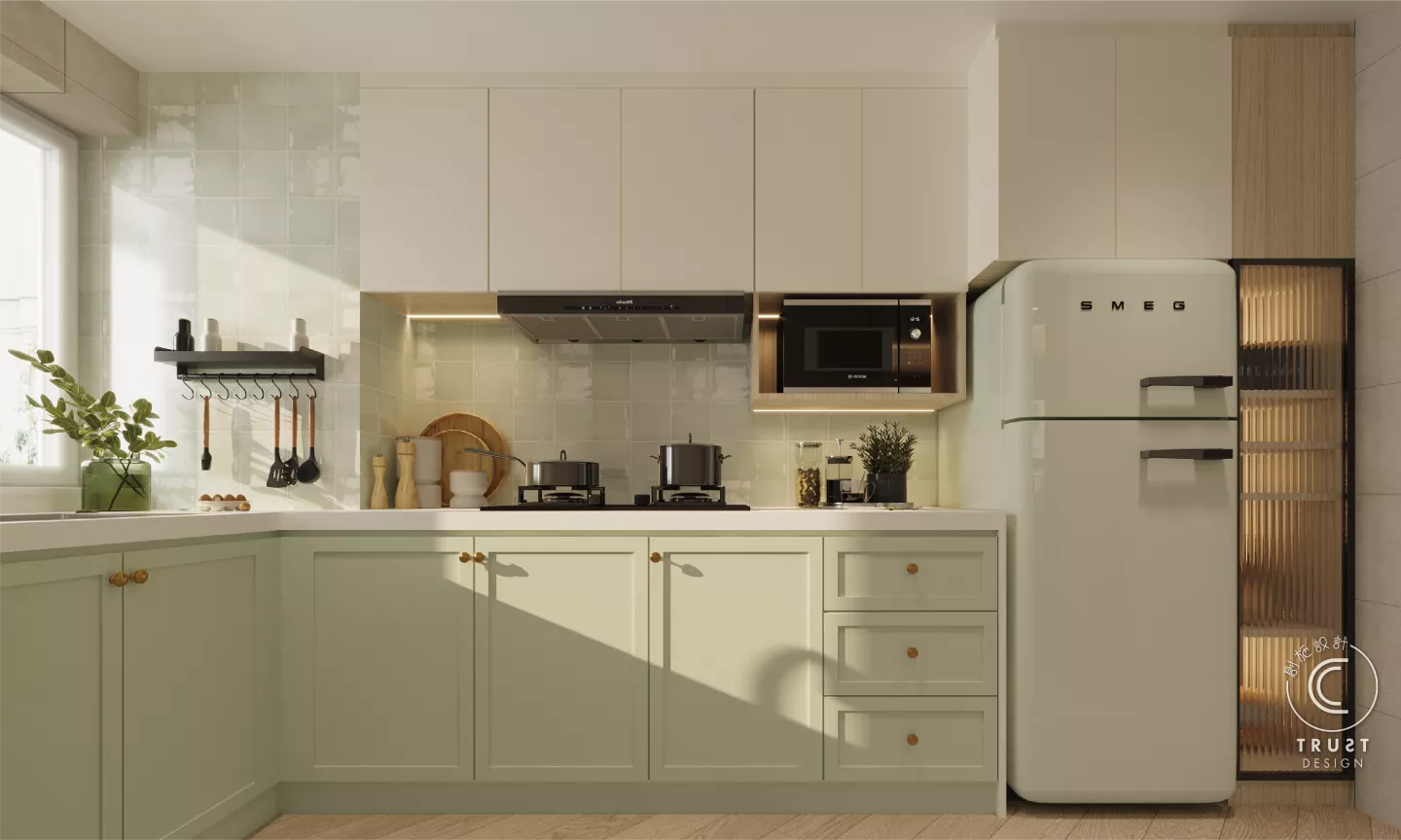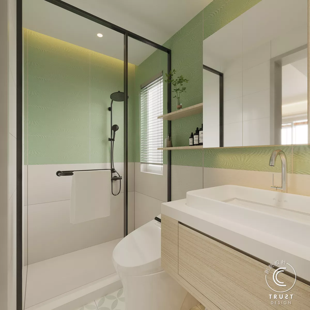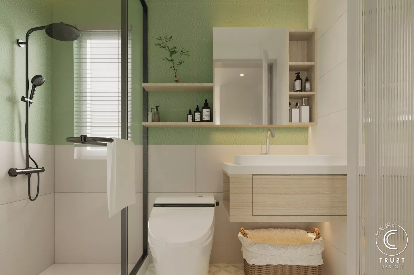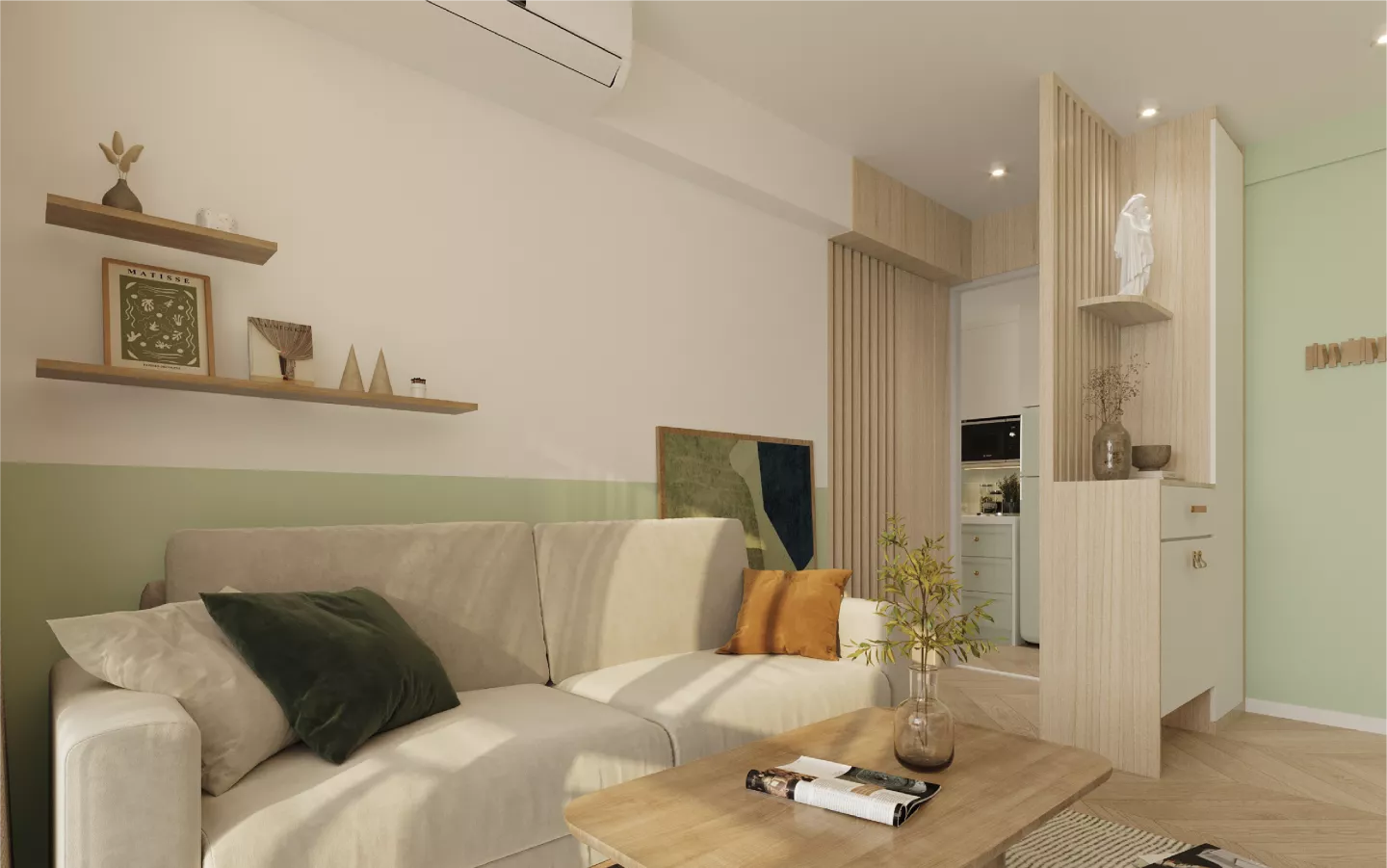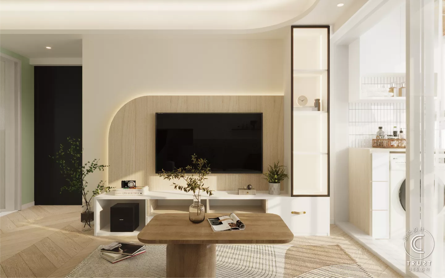 在日系風格中木色和白色基調上,我們以低飽和度的綠色點綴,為整體色調增添了一抹生氣,使空間更具活力,同時保持了原有的和諧感。