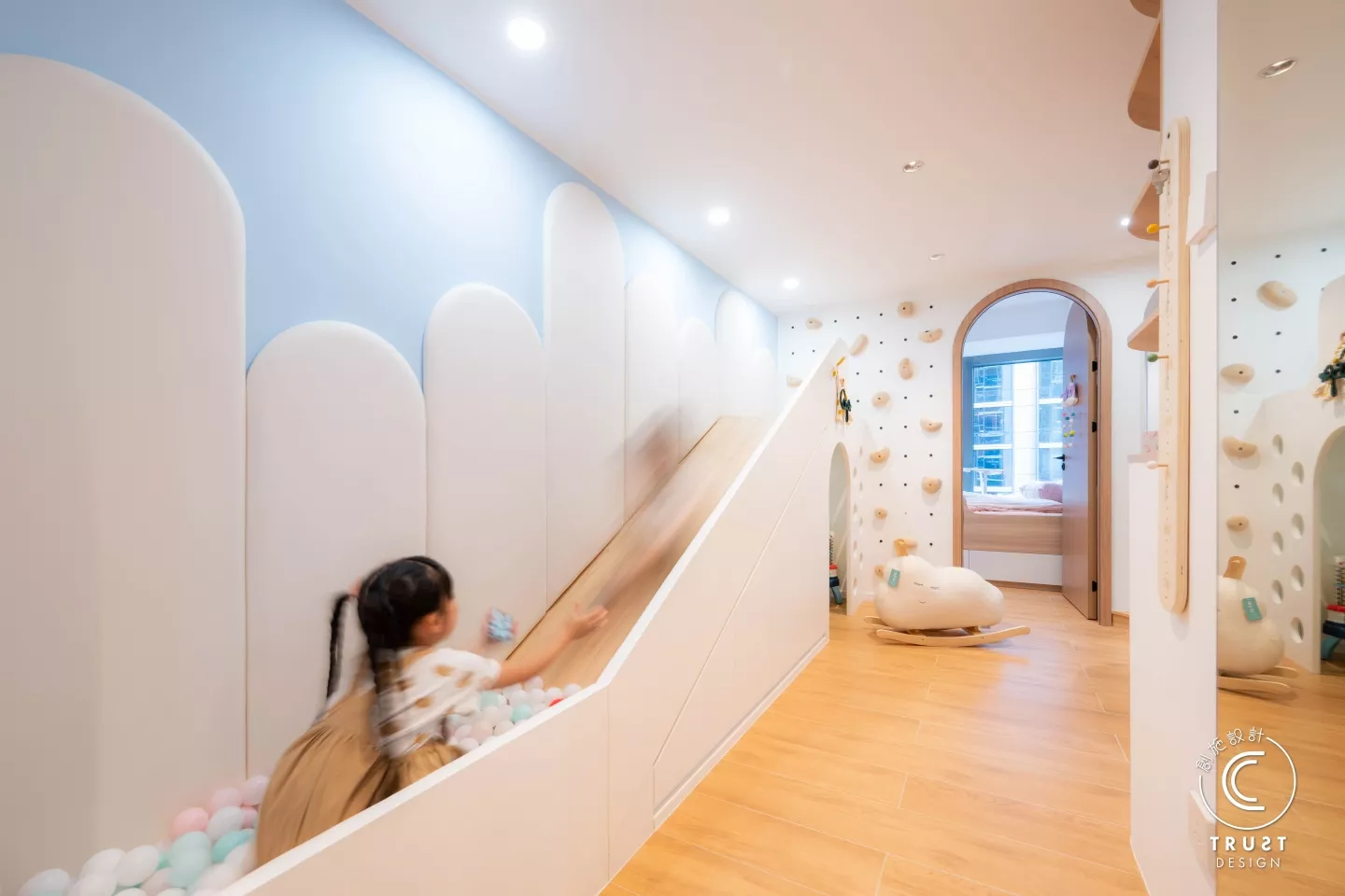 客廳裡的小小角落,有著攀岩牆和滑梯,小主人可以在玩耍中學習和成長,享受這個充滿趣味和活力的家居。