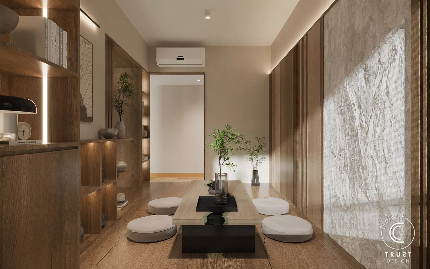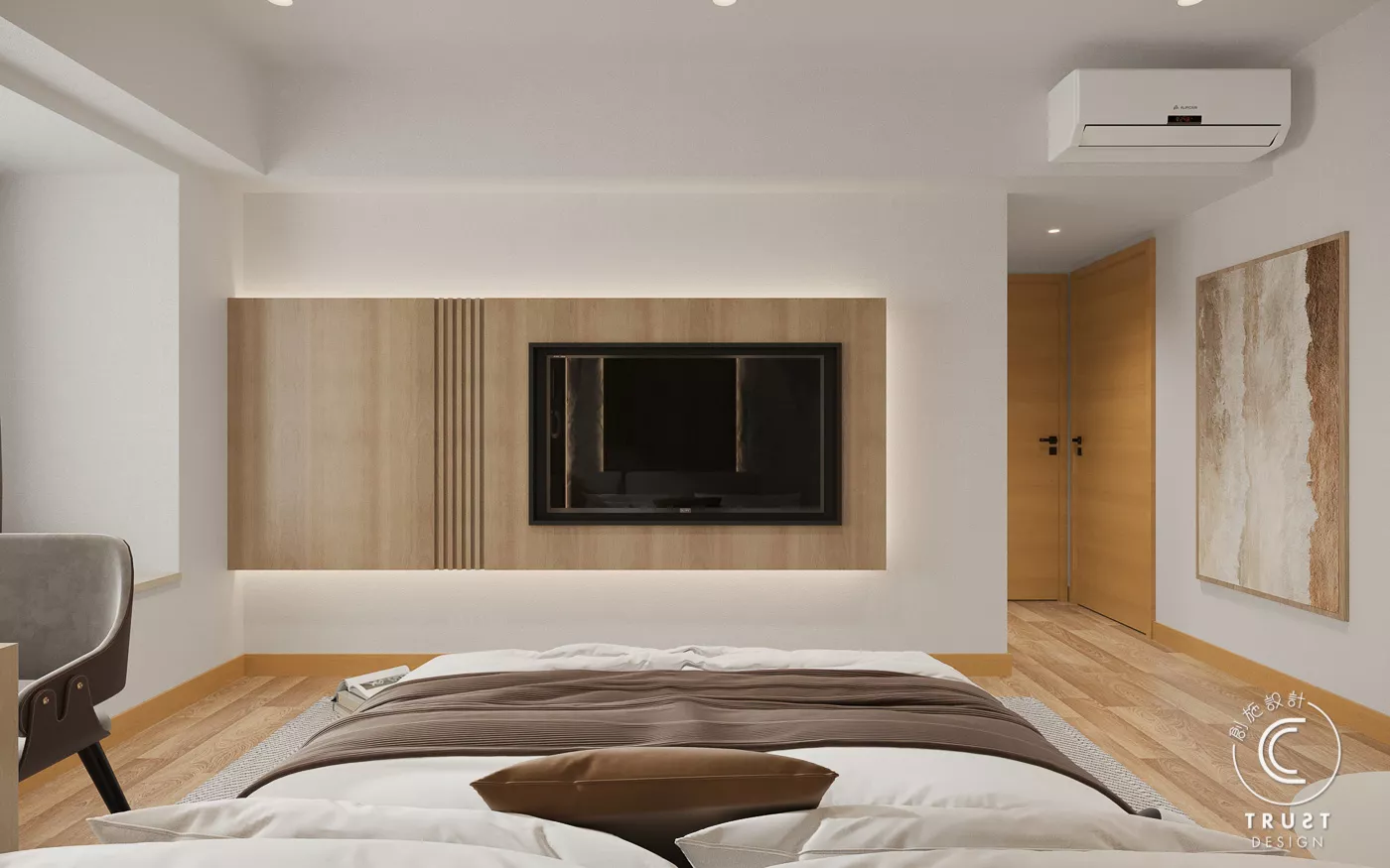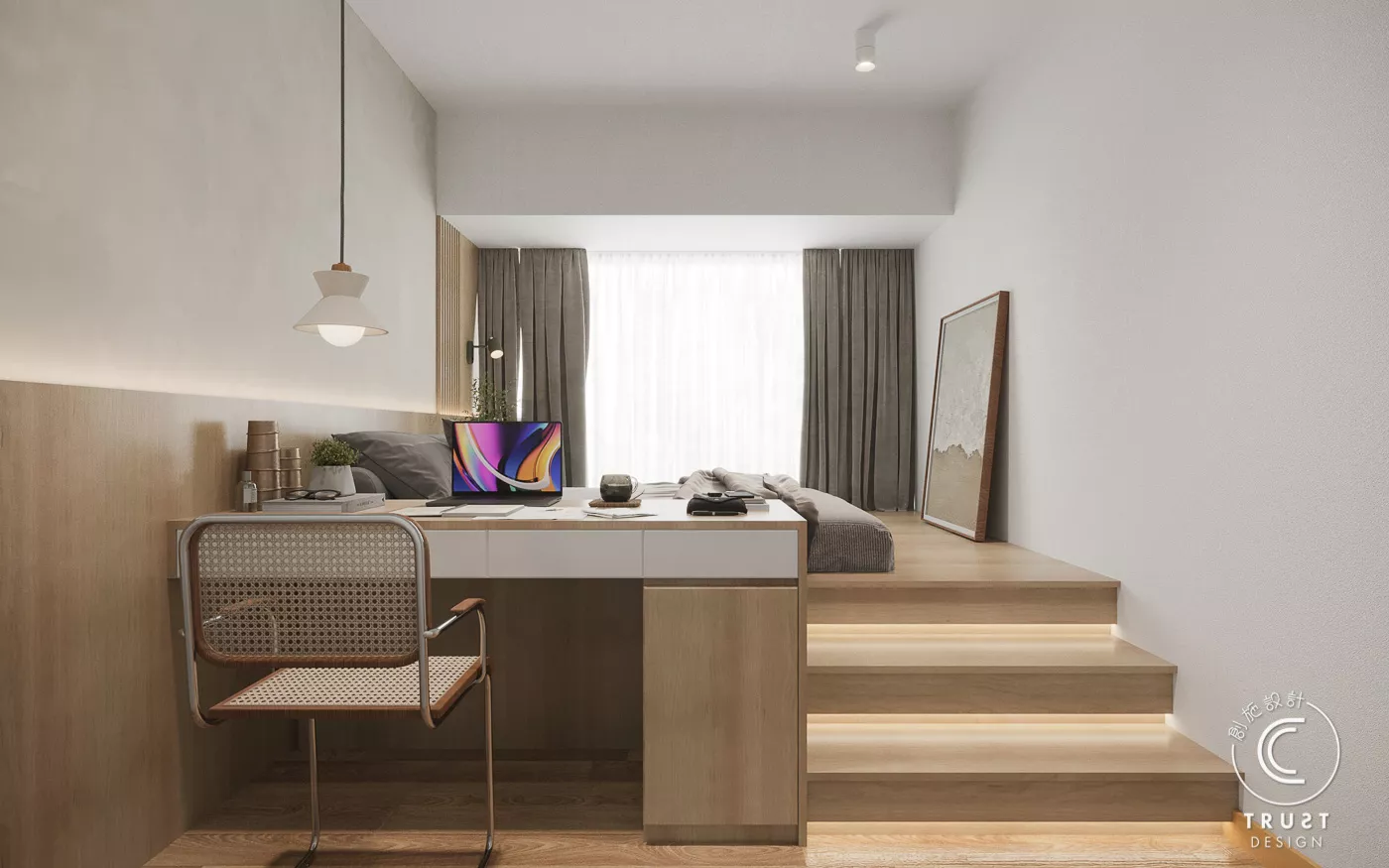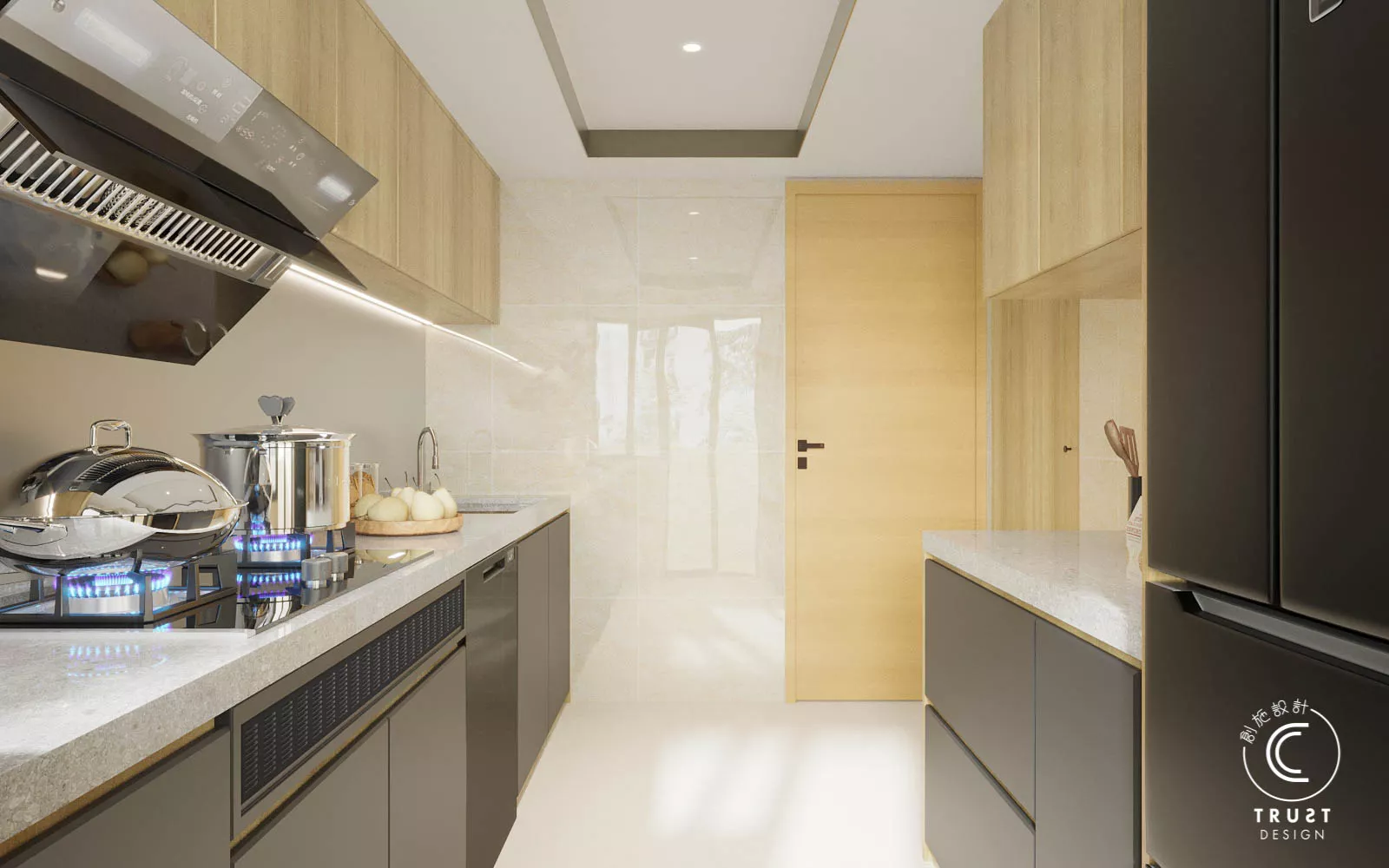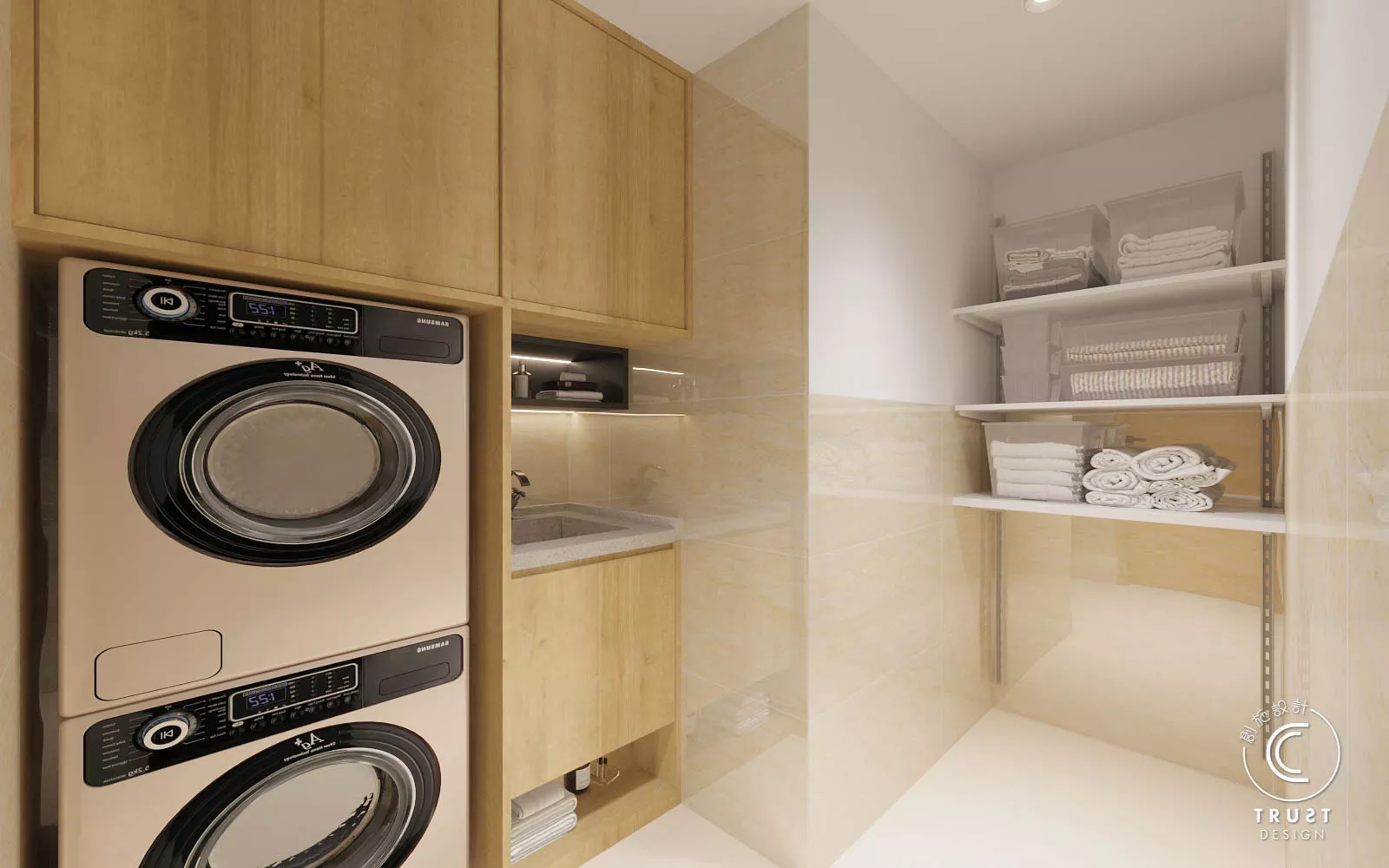 木紋與白色山岩板搭配,與客廳元素相互呼應,色系乾淨又有格調。